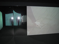 Without the live feed, my favorite part of all this was the kaleidoscopic tall mirrors that reflected in multiples not just all the video screens but myself as well, placing me in a sort of confusing space in which I could view what was projected in front, on the sides and in back all at once. The space was transformed and took on a relationship to my body and my perception that was rather interesting, and I was surrounded by multiple mirrored versions of a real body as well as mirrored versions of videos of people as well as mirrored versions of videos of drawings. I was the only thing that was real, and of course I couldn’t quite see myself whole, except in a mirrored reproduction.