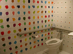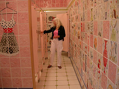 Terrific men’s room, that’s all I have to say. The women’s rooms were a disappointment–neither one took it far enough afield to be interesting and reverberant. The installations in both mens’ bathrooms were about thinking big, doing big, creating, making a mark on the world and achieving greatness. All things that should be gender neutral but here were sex-linked because of their placement in the bathrooms. That’s a complaint I guess.