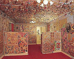 Perhaps the most exquisite merging of utopian vision and real world came in the small house of Loy Allen Bowlin, the original Rhinestone Cowboy from McCOmb Mississippi. This extreme extravagance wrought on the walls, ceiling and every other surface of the small house that actually was the living space of Bowlin, shows how a vision plus hard work and some amazing low tech materials can transport the spirit like nothing else. We walked through the small house, recreated in its entirety at Kohler, and oohed and aahed. Kitty remarked that his glitter and glue combination must have been perfect because there were few particles on the carpeted floor. Joe, spying some errant flakes on the rug, commented that they probably vacuumed daily.