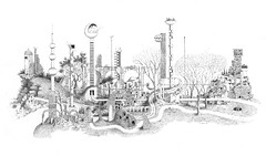 An exhibit titled “Utopia” brings together 24 artists (and an artist group) from around the world with art both dystopic and utopic. The joy for me in this exhibit was to run into four works by the great Randall Sellers, Philadelphia drawing artist whose microscopic graphite utopias suggest harmony reached after a major battle between man and nature in which both parties called a ceasefire and while the war’s not over, there’s momentary peace.