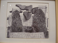 Dustin London’s ink drawings of spaces- and places-that-never-were sport madly textural hatchings. I especially liked the simpler images, where the picture was more about the hatched textures and hairy visions of nature, and less about the details of place. Some examples were Haystack, Weave, Cactus Flower and Rugg II.