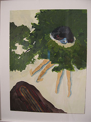Siobhan McBride’s brand of surrealism mixes Gauguin blobs of nature with symbolic birds–her personal strange visions of paradise found. The birds are a little awkward and out of scale to whatever their loopy environment. I’m not sure what these are about in a big sort of way, but they amused me and I enjoyed looking. McBride, like Prayzner, graduated from the MFA program at Penn in 2005.