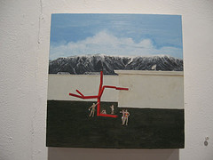 Andrew Prayzner continues his exploration of post-9/11 suburban weirdness. My fave was Shapiro Wash-Wax, where a bevy of bikini-clad babes surround a sort of phallic Maypole gizmo (oh, I know that’s redundant). The lasses stand ready to rub and shine. Prayzner, who showed at the Voxennial and Operation RAW, paints the de Chirico plazas and palazzos of Lower Merion and Upper Holland with a mix of twinkle, horror and irony.