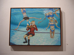 Also in the show is a single surrealist painting of a robot with a human inside, from illustrator Adam Rex, whose work was at the Green Line Cafe recently (see post). Cartoonish semi-human fantasy figures from Brian Zegeer made me think of book illustrations. And figures in swimming pool scenes, by painter John Klinkose, are in some cases narrative, in others all about the play of water and light on skin. David Pappecino plays peek-a-boo with female nudes behind scrims of abstract gestures.