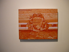 Mauro Zamora’s painting of an explosion hole ripped into what looks like a train (perhaps a reference to those bombings of the Spanish railway?). Another lovely work portraying contemporary horror.