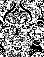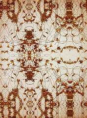 Not that I’m comparing, mind, but take a look at these two images (Talia Greene’s at the top of the post and A.J. Purdy and Jason Hsu’s collaborative drawing just above) and see if their decorative impulses don’t strike a chord — the overall totem-like design, the interweaving of organic and man-made, the spidery, internalized imagery, the virtuosic handling of material…