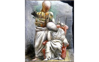 But check out these two paintings and count up the number of affinities there are. Pretty spooky. We love the way Guston got all of those politics in–KKK headdress and the good old boy with the big cigar. We also like the green window shade which was a mere aura in de Chirico’s work.