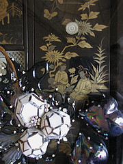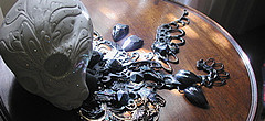 And at the Design Center at Philadelphia University, Crazy Quilt, Virgil Marti’s Selected Works (up through Nov. 17, ) takes over three rooms in the otherwise spare 1950’s ranch-style house, and Goldie Paley must be turning in her grave. I think the first room is worth the trip to East Falls: a modern take on the sort of cast stucco decoration that reached its height in the eighteenth-century, huge flowers sprawling across the walls, with integral illumination. A close inspection reveals that the stems are cast from human femurs and the inner layer of flower petals, surrounding the silvered light bulbs, are skulls. The piece works remarkably well as decoration, although it would be a brave patron who installed it in a functional space in her home. What a background for late-night dinner parties; it would be wonderful if it found a home in Philadelphia.