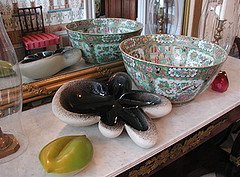 Her deft but effective addition to the fountain in the garden is a winner – I’m not revealing it – just go see it. The afore-mentioned gilded skulls appear in the breakfast room along with other Depew ceramics, some so consistent with the house’s furnishings (a luster-ware over blue and white dish) that one thinks they belong. Her ceramic table arrangement has something of the quality of a vanitas painting done in cake icing. According to Wuilfe, Depew was fascinated by the combination of history, science and decorative art that is the legacy of Dr. Physick (known as the “Father of American Surgery”), but her response to the visual exuberance of the furnishings is more obvious.
