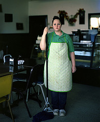 On his website, Renaldi has his work grouped by projects including bodybuilders, Fresno, the farm, fathers and sons, the great plains, tattoo boys and one of my favorites, bus travelers. The book pulls some of the strongest images from the projects and lets them run together – ungrouped from their project moorings – to become a wash of contemporary people and places. The flow of images in the book reminds me of how Zoe Strauss agonizes over the flow of her images for her Under-I-95 exhibit and for the slide shows she puts together. And indeed the flow is important. And here in the book, the story that unfolds from East Coast to West, is one of 21st Century nomads. The “family of nomadic man.”