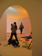 Ernesto Netoat Tanya Bonakdar has built a playroom from a stretchy carnival tent. He’s the soft and squishy Richard Serra putting your body in a space that overwhelms. We liked his Fabric Workshop piece a few years back a lot better.