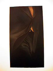 The reason we liked Melanie Baker‘s piece in the group show at Roebling Hall was the surprise of scale, focus and materials. The work — whose meaning puzzles us — puts your eye at crotch level. And the suit is elegant, the image is pasted to the wall and even though it was nothing at all like Steinkamp’s work it had some of the same cloth fluidity thing going on. Like Steinkamp’s work though, it is iconic and ephemeral.
