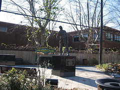 The bronze 7-foot figure (which seems far smaller), is by sculptor Phil Sumpter, and right off the bat I need to complain that the only sign of his authorship is his last name scratched into the sculpture itself on the back. The artist deserves more respect.