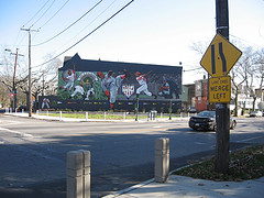 The mural seems designed to offer its image to cars on the move. However part of its background–the giant grass, the giant baseball–is a distraction, and the deliberate, pasted-on look of the figures is a puzzlement.