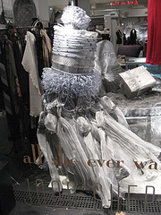 Amdur, a Pittsburgher who recently moved into the Philadelphia area, has gone over the top with classic silver-gray screening to decorate Shepp’s window and interior. The result is Miss Havisham meets Dick Clark for the holidays. The pieces have a celebratory affect mixed with a hint of decadent menace. The chandeliers in the window droop a bit with spider-webby ennui. And swaths of silver tubing threaten to entangle anyone who comes to near, mixing opulence with do-not-touch scratchiness.