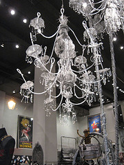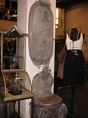 Chandeliers of screening share the window with clothing for sale and other screening art objects.