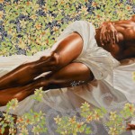 We just signed up for Google stats, and imagine our surprise when some blog we never heard of turned out to be a key source of hits for us this first week. So we checked out Fette’s Flog-Aesthetic Los Angeles and found an image by chicken artist Eric Fausnacht (see artblog post) next to an image by hip-hop-meets-art-history artist Kehinde Wiley. The wallpaper’s a total match. So check the Flog’s Jan. 18 post.
