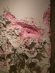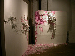 Navigating the Ecstasy, two small walls each made of foam, wood, wire, fabric and paint and each distressed and gouged as if eaten by a giant rat, reminds me how lovable and detestable is the impulse to decor. This piece, in which the gouged areas have been painted pink is like decor gone bad, like the cake on Miss Havisham’s wedding table, repulsive and poignant for all its dashed hopes and angry dreams.