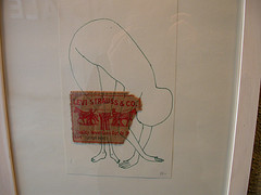 Hedwige Jacobs drawing with marker on paper and cut fabric–the logo from a pair of Levis jeans.