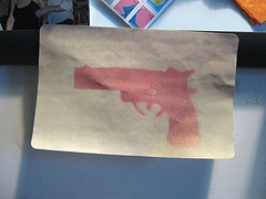 While I’m on the subject of guns (see previous post), when you see this much gun art, you know the war in Iraq and the local death toll from gun violence is creating anxiety among young artists. I pulled this baby off a telephone pole. It looks like it’s stenciled with either an airbrush or spray can. It’s a beautiful, pearlescent lipstick color on a kraft-paper sticker.