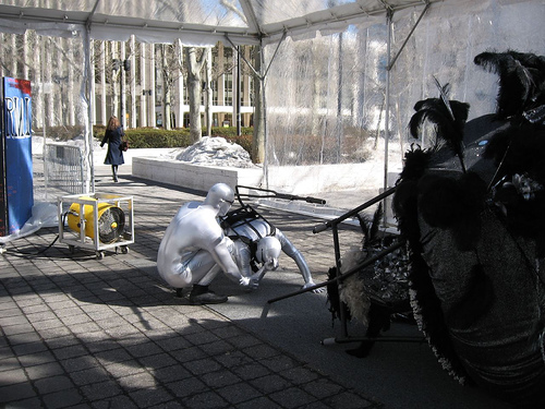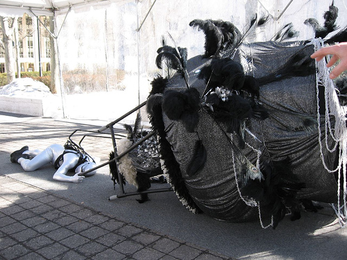 The highlight of our weekend was home-townie Gabe Martinez, who delivered a performance piece that broke my heart (presented by Samson Projects). The biggest surprise was the figure in the piece turned out to be a real human being. Well, two real human beings, taking turns, spelling one another from the torture of lying totally still on the cold, cold ground in silver athletic suits as thin and clingy as saran wrap.