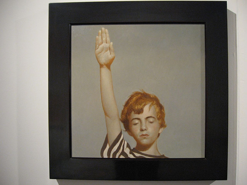 The other Philly blast was PPOW’s sale of Bo Bartlett’s new anti-war painting at PULSE. By time we got there, the painting was no longer on display and only the study of the boy remained. I would put up the image he sent along to us about a month ago, but I can’t get on to my gmail account, as I mentioned before, and that’s where I have it.