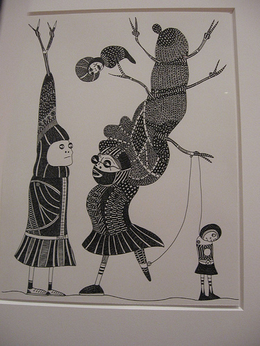 I especially liked the topiary hair of one armless couple whose bundled topknots are anchored by antler/tree-branch/scissorhands, one blade of which impales a baby/pod creature, and one of which dangles a child from a leash around her neck. I also like that the more elaborate of the two, who appears female, is a bearded leady and the guy-like counterpart is smoothfaced and less ornate.