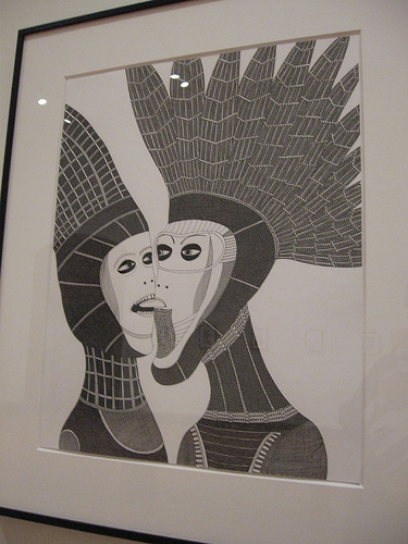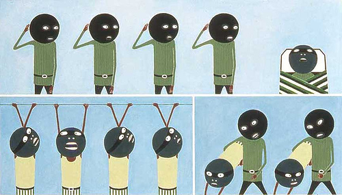 These pieces, are closer to the humans-as-creatures cartoons of younger artists like Marcel Dzama and Ben Woodward. If the drawings are meant as finished works, the pieces seem to concede that tribalism is in the blood, that the rules of engagement are forever inscrutable, and what’s the use in raging against the machine of culture?