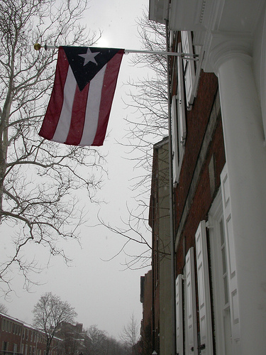 Roxana Perez-Mendez’s Puerto Rican flag outside Powel House. The artist said that the flag drew in some Puerto Rican natives the night of the opening. They didn’t know what was in the house but the flag told them to go in and check it out.