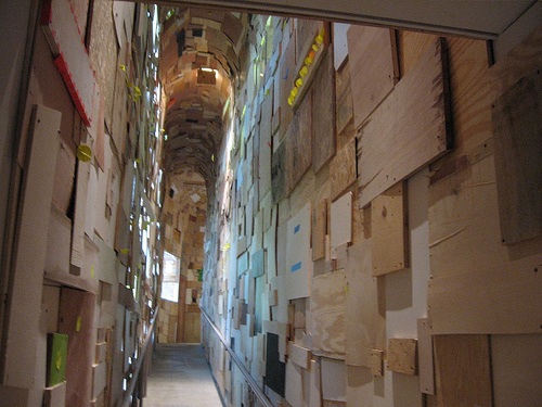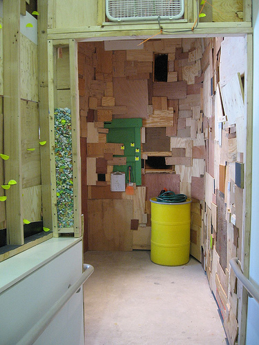 Washburn’s cathedral of detritus holds the space with architectural spectacle that transforms the ramp from what it is to what it should be–a powerful soaring arch made of reused bits of wood shingled up the walls and over the top. That arch transforms what would normally be a survivalist cabin into a statement about taking back the earth.