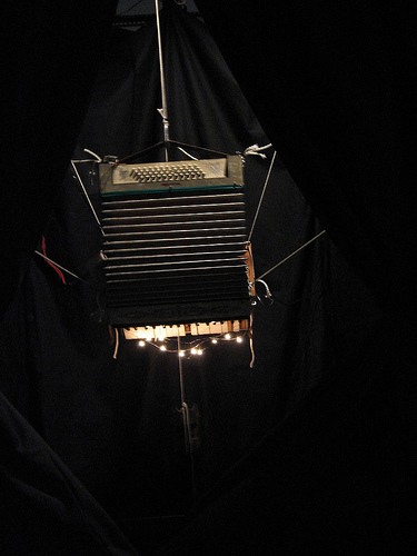 There’s no attempt to create a humanoid with Misericordiam, by Ranjit Bhatnagar, an accordion hung from a rope. It compresses and, thanks to gravity, decompresses with a convulsive abandon. I don’t know if it had any other purpose than humor, but I didn’t feel like I needed more.