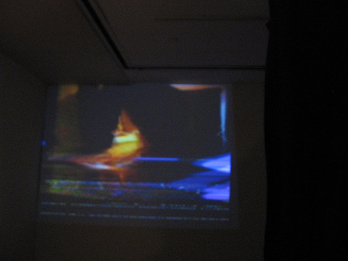 The only other working piece, Retrospectrum 3.0, by Yoav Bergner and LoVid (Tali Hinkis and Kyle Lapidus), needed too much explanation. It is a robot that makes video images using three camera eyes plus a “brain”–and “arms” on tracks that look like traveling backpacks. The backpacks create interference to modify the signal sent by the eyes, thereby creating the “art,” which is projected on a screen.
