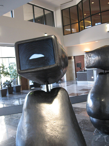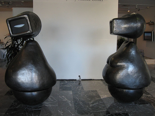 Actually, there really is some sort of conversation going on. The gallery notes state, “Each is capable of manipulating the other’s feelings.” Iona especially, with her droopy breasts and curvy butt is a robotic Venus of Willendorf. I’m not sure who Neil was modeled after–Homer Simpson? I don’t recall hearing the sounds they make, but I accepted them right off the bat as fellow creatures with intelligence and charm.
