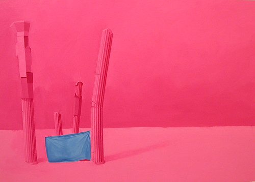 Jaime Treadwell’s hot pink landscapes echo Lisa Yuskavage’s color while avoiding the buxom baggage. Joseph Borelli’s pink carved foam figure, Adam Parker Smith’s embroidered and stitched homage to Marvin Gaye, and Natasha Bowdoin’s cut-paper word piece are virtuosic and thought-provoking.