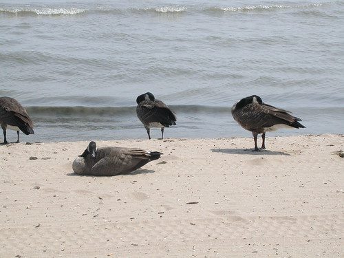 On the beach were the requisite seagulls, the brown ones the ones with the yellow beaks the ones with the orange beaks. But there was also a flock of Canada geese, something I don’t remember seeing before on the Lake Michigan shore. They were swimming and sunning and sleeping just like beach-goers everywhere. We tried to sneak up and get some pix.