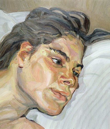 Freud’s palette is as restricted and distinctive as Rembrandt’s; I could recognize one across a gallery, even out of the corner of my eye. His mature work makes a remarkable association of paint and flesh, and he has a rare appreciation for the qualities of skin. In “Portrait on a White Cover” (2002-3) Freud depicts the translucency of the model’s flesh which reveals a vein along her leg; this made me think of the same effect, which I’ve always loved, in Rubens’ “Chapeau de Paille” (National Gallery, London), where the artist indicates the veins in his sister-in-law’s decolletage.