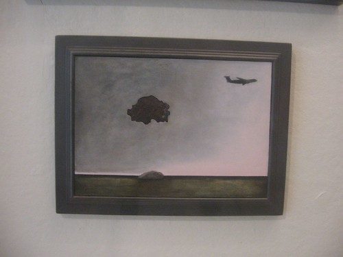 Anne Minich’s dark Cloud, with its little airplane and unlikely rocky mound put our lives here on earth into some sort of perspective–and broaden the theme of the show beyond the cityscape.