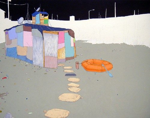 Survivalist embattlement has been on the art world’s radar for years. Rirkrit Tiravanija, Andrea Zittel and TODT all make objects that presuppose a nomadic culture of DIY and share a common experience of want, desire and resignation to a world order that’s not so orderly. Zittel and Tiravanija’s works embody both critique of and fascination with our culture, while TODT offers full-blown condemnation. In Philadelphia, Mark Shetabi’s peephole environments and grisaille paintings of parking garages, and Amy Walsh’s miniature cardboard squatter encampments, work similar terrain.