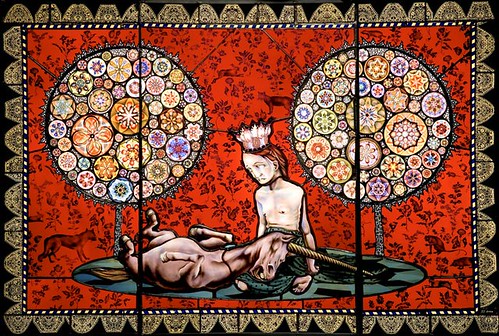 Work at Claire Oliver by Judith Schaechter, the Philadelphia stained glass lightbox master, looked spectacular and mysterious as ever–and really the main thing of interest that we saw that had no political or historical bent (other than art historical, like the above, with its reference to the Unicorn Tapestries). Schaechter, who defined Goth before Goth was a twinkle in a hipster’s eye, delights with patterned scenes of damsels in distress, insect invasions, Miss Havisham interiors and cats gone wild. Amazingly, she continues to perform all this without ever getting lost in the conventional.