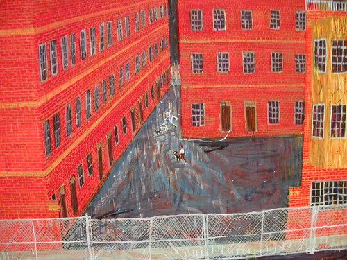 Independence Day, for example, is an urban tableau depicting several actions taking place over time in one compact epic picture. The 4-foot-long work shows fireworks over the artist’s Chinatown North neighborhood. A dog is tied between two prison-like condo buildings and a human figure with another dog approaches the tethered animal. Further on in the same painting, the figure—now with two dogs—is seen running up the street. McEneaney said at the opening that the painting is about her rescue of a dog that had been tied up outside in the rain.