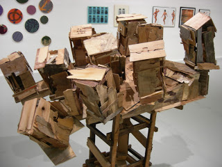 We discussed the exhibition further and Franky told me about the work of another Carribean sculptor, Earl Fyffe of Jamica who, much to Laude’s amazement, arrived with only a bunch of wood and constructed Shanty entirely on site; much as the shacks of its subject are quickly assembled, I guess. Franky then introduced me to Shervone Neckles, one of the curators who had accompanied the students from New York. Shervone is a multi-media artist who received support from the Joan Mitchell Foundation and was teaching under its auspices (by the way, the Foundation has supported many artists with Philadelphia connections, including Mei-Ling Hom, Karen Kilimnick, Sarah McEaneany, Gabriel Martinez, Odili Donald Odita, Pepon Ossorio, Jody Pinto and Nami Yamamoto). Shervone and Sophie Sanders had been discussing the exhibition’s theme for a while. The exhibition also grew out of a series of three symposia at Temple that explored contemporary art from the perspective of African influences. It’s not a new subject, Shervone acknowledged (hardly; it was significant to artists since the 1920s and has been written about by scholars including Paul Gilroy, Robert Farris Thompson and Richard J. Powell). But that doesn’t make it any less current, as the varied and often provocative work in this exhibition attests.