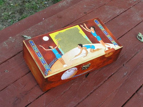 She never let her admiration for accomplished painting limit her to canvas. When we were in our 20s, Millie and I each had wife-beater shirts decorated with enormous vermillion roses Maryanne had painted on them. And for many years, Millie carried her glasses and her money in leather pouches Maryanne painted. More recently, she painted furniture (I have a chair of hers that I gave to Murray as an anniversary gift) and beautiful boxes, one of which Millie gave me as a gift. Maryanne also painted ceramics with her father. “She put her full force into anything she did. Her ceramics are incredible,” said Millie, who called me early this morning with the bad news.