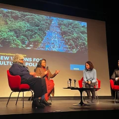 The new work creates an embracing space, a sort of fantastical hideaway amid the creeping roots and biomorphic forms.