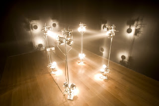 Around the corner from Ventilator is a small exhibition, Geometry of Motion (through June 23), in which Roxana Marcoci and Klaus Biesenbach, MoMA film and media curators, have selected work from the museum’s collection which preceded Eliasson’s in dealing with motion and projected light. It includes work by Hans Richter (continuous viewing of Filmstudie of 1926), Marcel Duchamp (a film of Anémic Cinéma, 1926, and the mechanism for creating rotary motion, which wasn’t working, unfortunately), Robert Irwin (one of his discs from the 60s), Robert Smithson (the artist’s film of light effects on Spiral Jetty, 1970), Anthony McCall (a dance he choreographs between images projected via a slide carousel and their viewer-generated afterimages) and others from El Lissitsky to Gordon Matta-Clark. The obvious omission is Thomas Wilfred’s color organ, which was on view in MoMA’s basement in the 60s-70s where it was seen by everyone who attended the film programs. Still this show, while small and quiet compared with the Eliasson extravaganza, shouldn’t be missed.