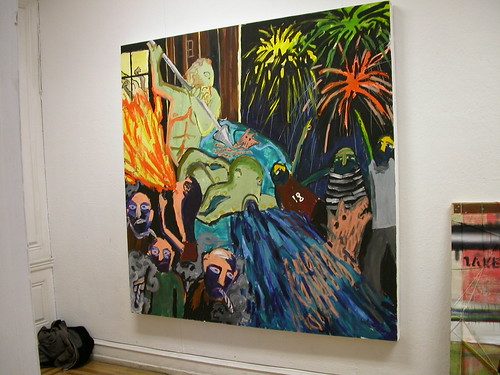 I know Alan from fall, 2006, when Libby and I co-taught a senior painting studio at Tyler. During that semester he was painting photo-based angst-filled works featuring a lone sports figure in a void of space or perhaps a team together where each person seemed completely alone. Interesting, existential works whose demythologizing of America’s sports heroes — like that of Norm Paris — felt right for this time and place. Towards the end of the term, though, new works popped out that were more gestural and intuitive, channeling an inner muse fueled by literature and a need to tell stories. His senior thesis show debuted this new work — a coherent body with expressionistic style coupled to heroic themes involving the gods, humans and animals.
