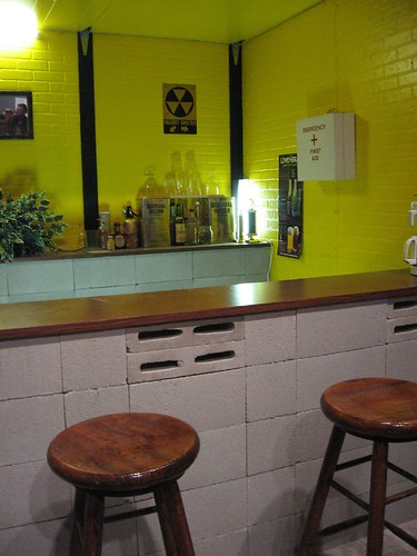 Wall of Mike, a wall of caricatures of Mike, were created by Smith’s friends and posted on the wall to look like a wall at Sardi’s, the New York eatery and celebrity watering hole. Set after set in the exhibit looks deliberately familiar–a family room with striped rug that sometimes appears on the monitor, looking for all the world like static lines across the tv. The Government Approved Home Fallout Shelter/Snack Bar is the actual recreation of a government fall-out shelter, made with cinder block and OSHA yellow walls. “You can send away for the plan,” Carlozzi said.
