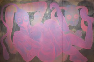 Also in the MFA group, Alana Bograd’s paintings have taken on the heavily curtained look of proscenium stages and castle interiors without losing their crazy psychedelic stacks of biomorphic shapes.