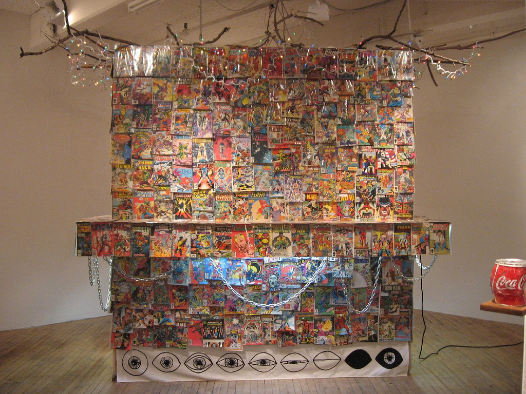 Although I admired the kiosk, which is beautifully put together, I sort of didn’t get it. The comics are inaccessible and overwhelming, with their superhero role model beyond reach yet overwhelmingly promoted–covered with plastic and draped in chains. The tree branches are like antlers and why twinkling lights? I don’t know. I did get a laugh out of the Cindy Crawford, however, the proverbial graffiti moustache as Micky Mouse ear orange slices and banana bunches.