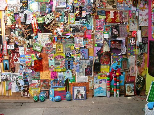 It looked like a paint storm had hit when Andrea and I wandered into PIFAS‘s exhibition space on the 4th of July. Dearraindrop‘s blast of perky colors in paintings, electronics displays and a “Fun Wall” of found toys, posters, record album jackets and advertisements was perfect for the holiday — raucous and celebratory with little bursts of silliness and most of all color.