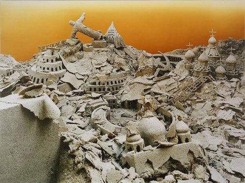 Photographs make their own reality in Mariko Mori’s six-panel photo, Empty Dream, and Liset Castillo’s Pain is Universal but So Is Hope (Orange). Mori embeds herself, costumed as a mermaid, among the bathers at an actual Japanese artificial beach. Given how improbable the beach itself is, the mermaid seems right at home. Castillo’s half-smashed sandcastles (models of iconic structures from around the world, dominated by Rio’s Christ figure on the verge of collapse) beneath a gorgeous orange glow suggest we’re all going to hell in a handbasket. The tension between what’s real and not real here has the reality of world politics and wars just below the surface.